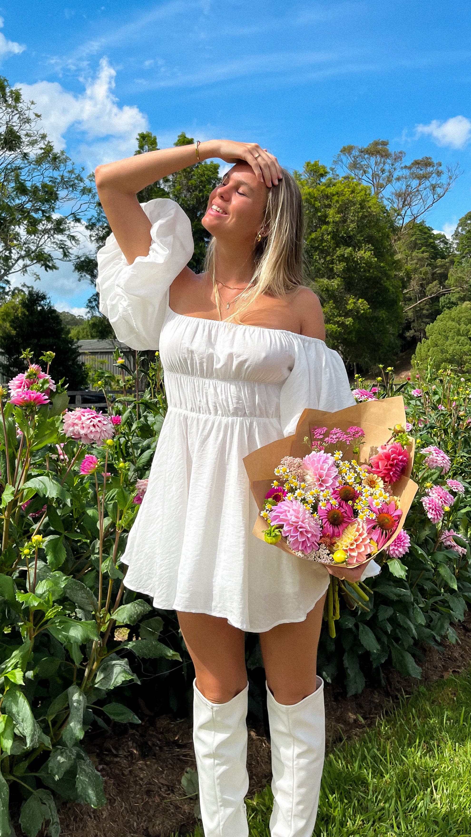 Introducing our Adi Dress - the sweetest mini dress of your dreams! Featuring statement puff sleeves, off-shoulder design, elasticized bust and flattering a-line skirt. This dress is the perfect multitasker - made for days in the sun with your girl gang or doubles as the perfect pretty party dress. To finish the look, we recommend pairing with our Lucy Heel - Clay/Clear and a bright lippy.