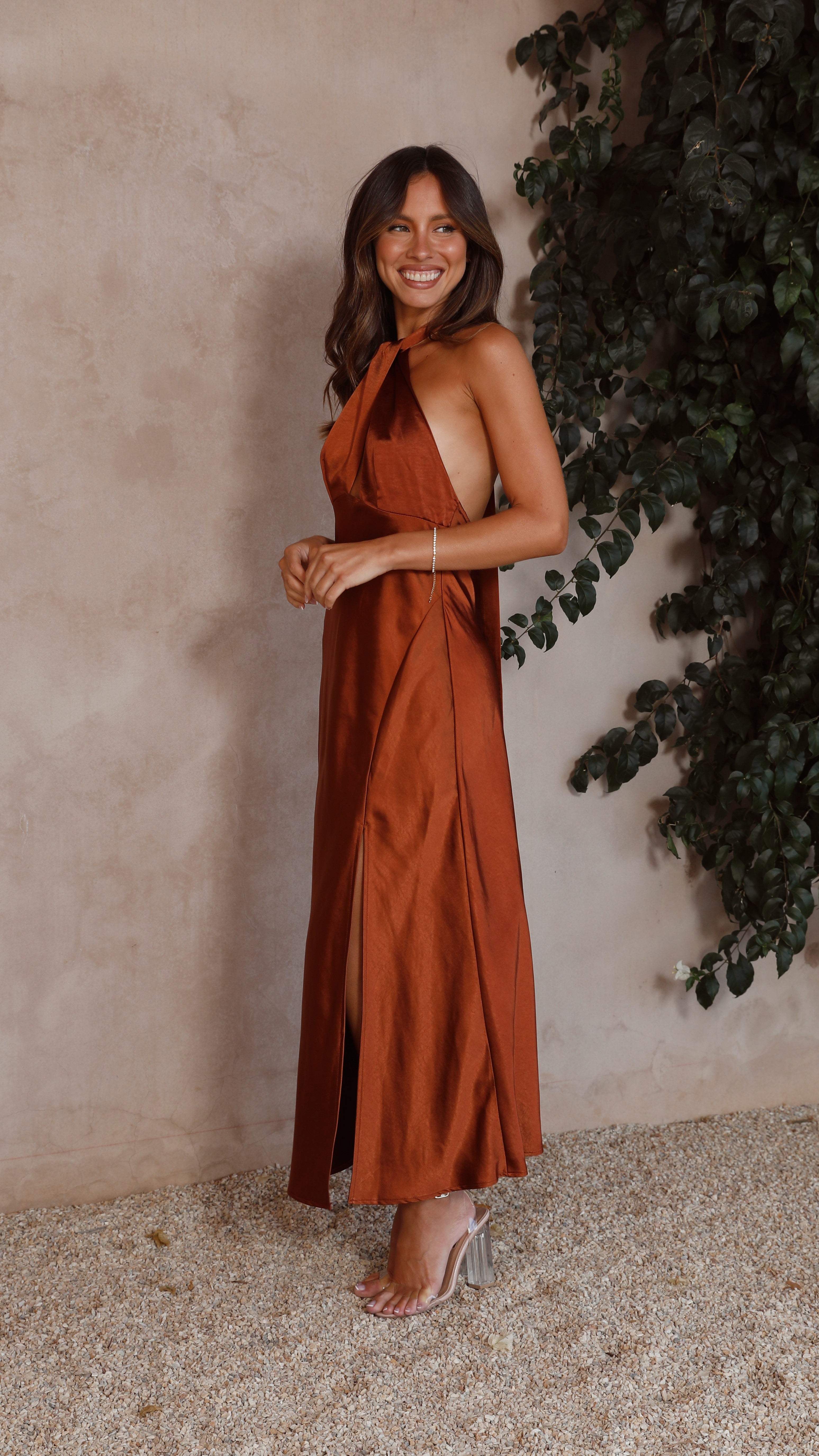 The Amalia Maxi Dress will be a stunning new addition to your wardrobe featuring a halter neck cut out detailing, adjustable neck tie, side slit and an enclosed zipper at the back.