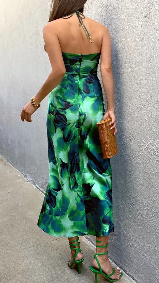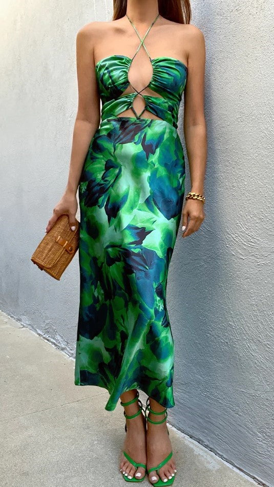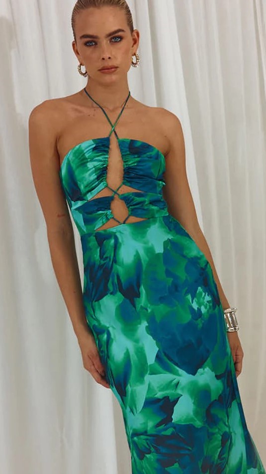 Our Blossom Dress features long midi length, a halter neck style with ruching details around the bodice with cut outs in the centre front, thin straps around the neck, gel tape around the bust and invisible centre back zipper. This garment has lining and no stretch. Body Fabric: 95% Polyester, 5% Spandex, Lining: 95% Polyester, 5% Spandex. Please refer to care label for garment care instructions. Colours may appear slightly different to the website due to lighting, computer picture resolution and monitor settings. Print placement may vary between each individual item.