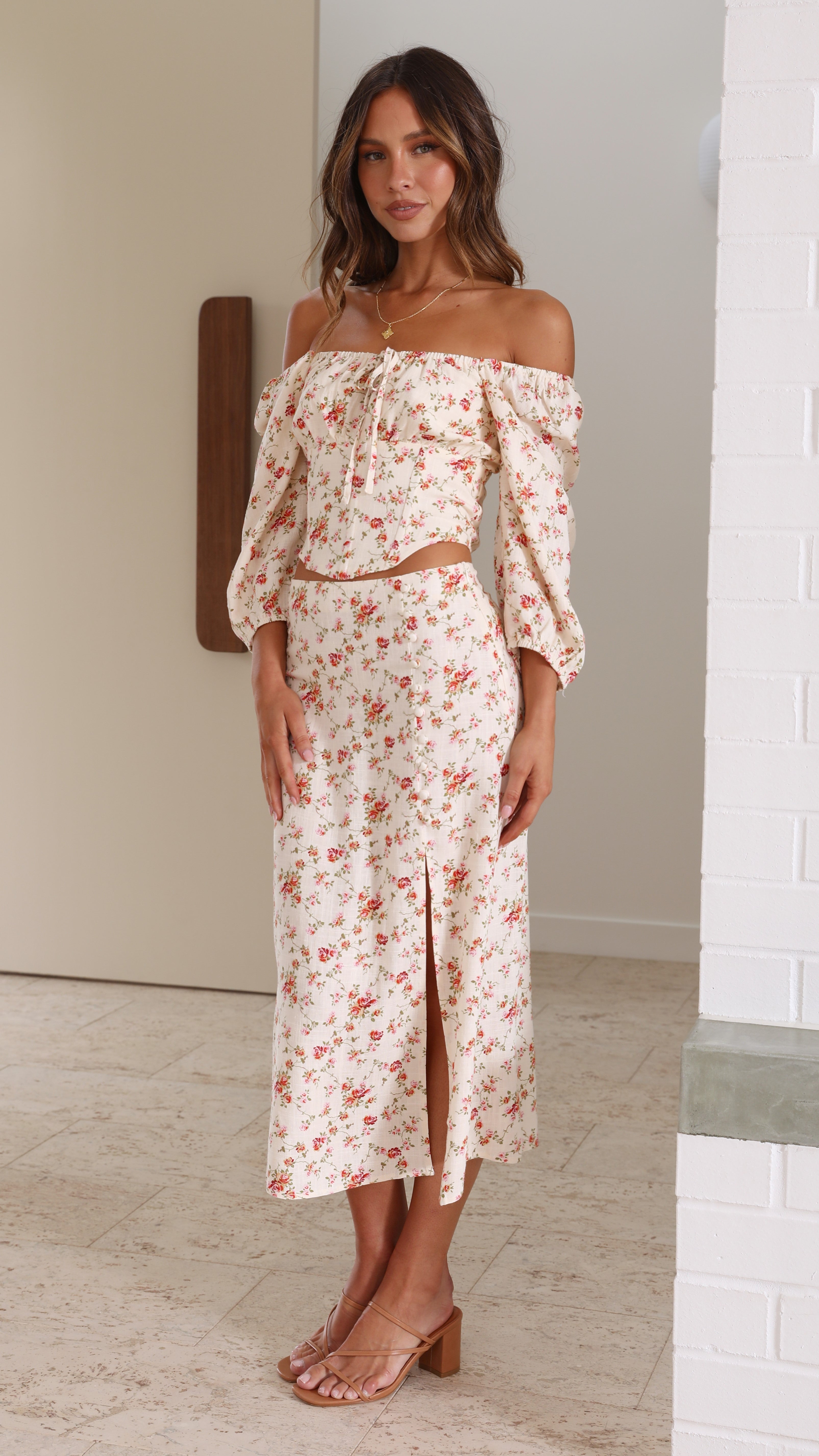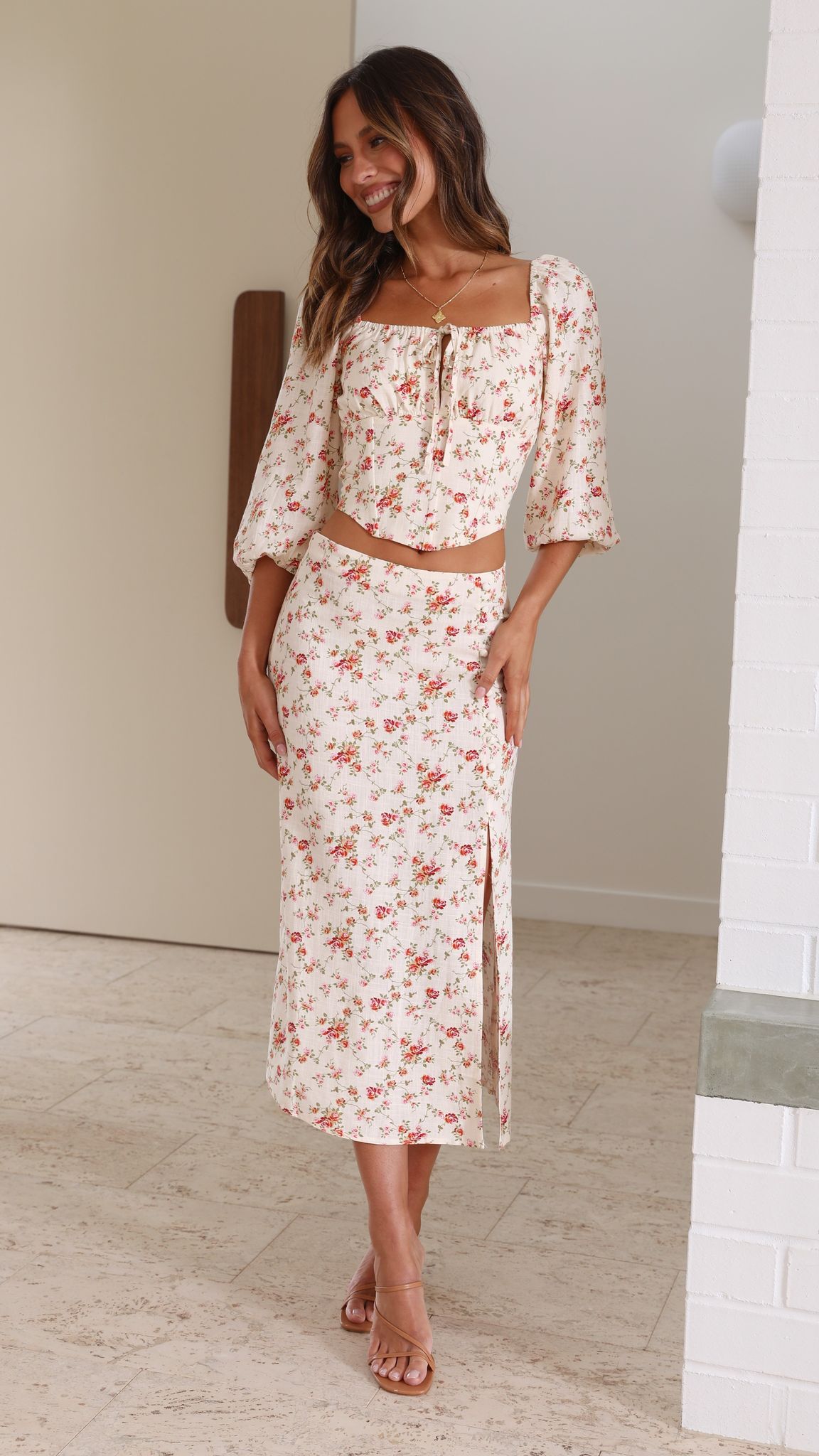 Get the look! Caroline Top - Rosie Print & Yazmin Heel - Sugar Brown