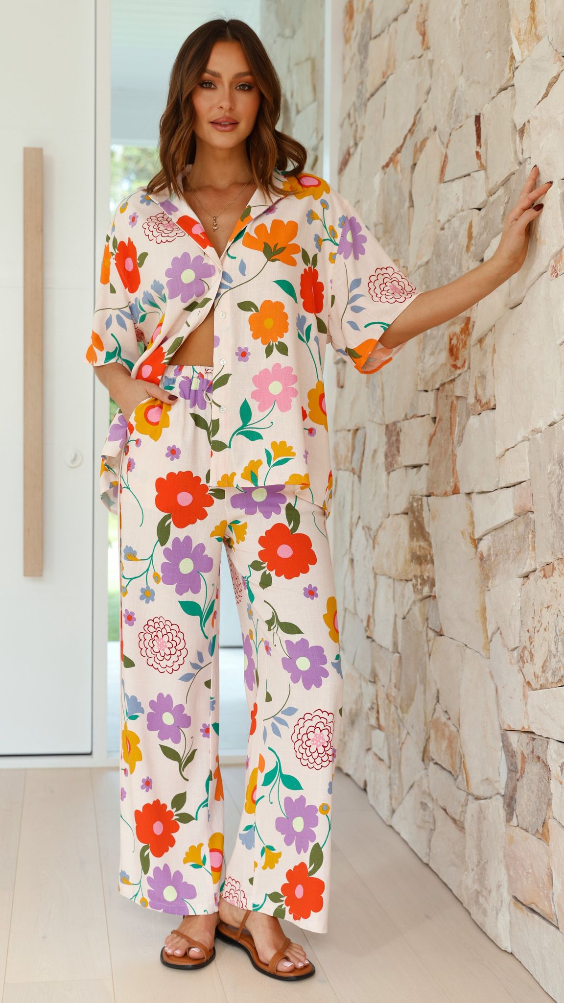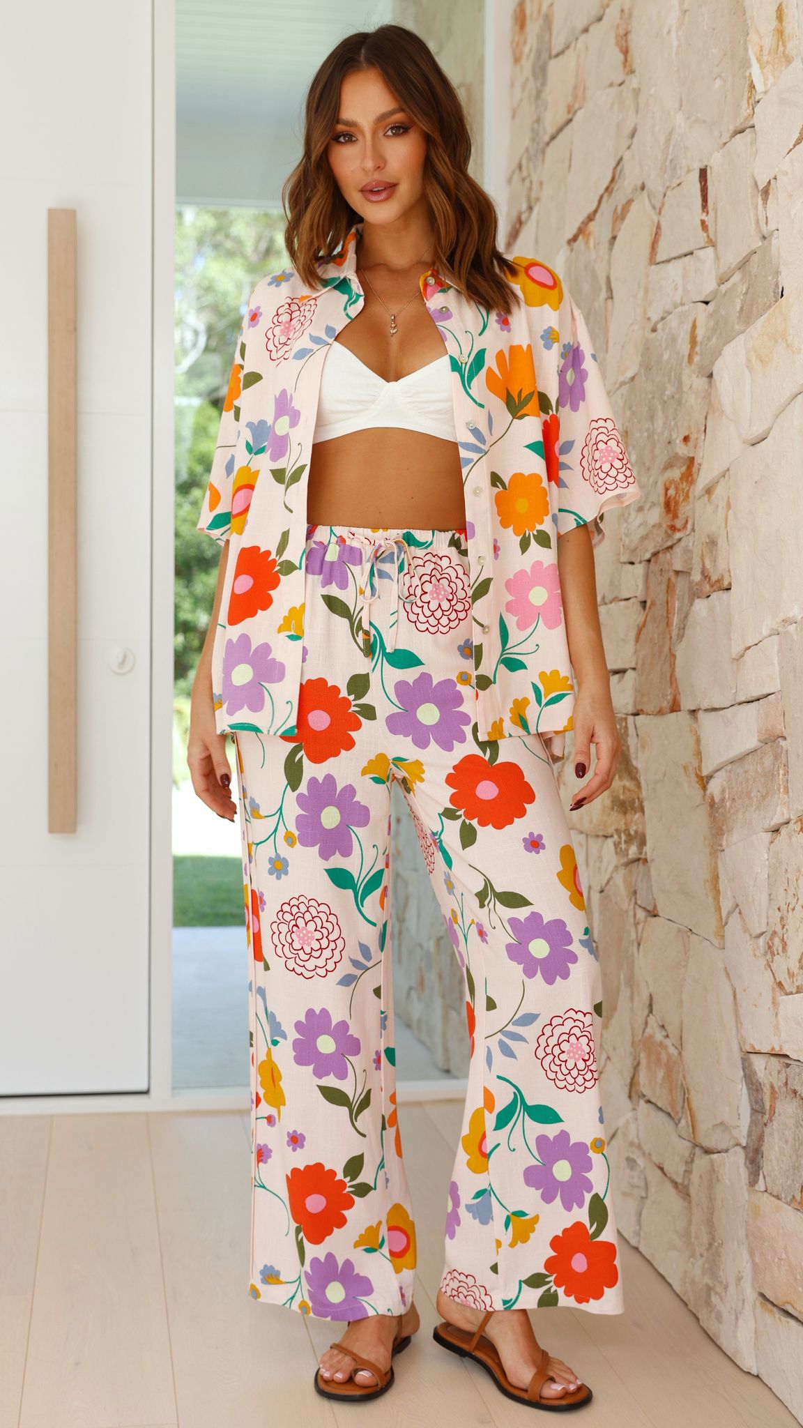 Get the look Theon Slides - Tan, Whitney Crop Top - White & Calus Button Up Shirt - Amsterdam Print