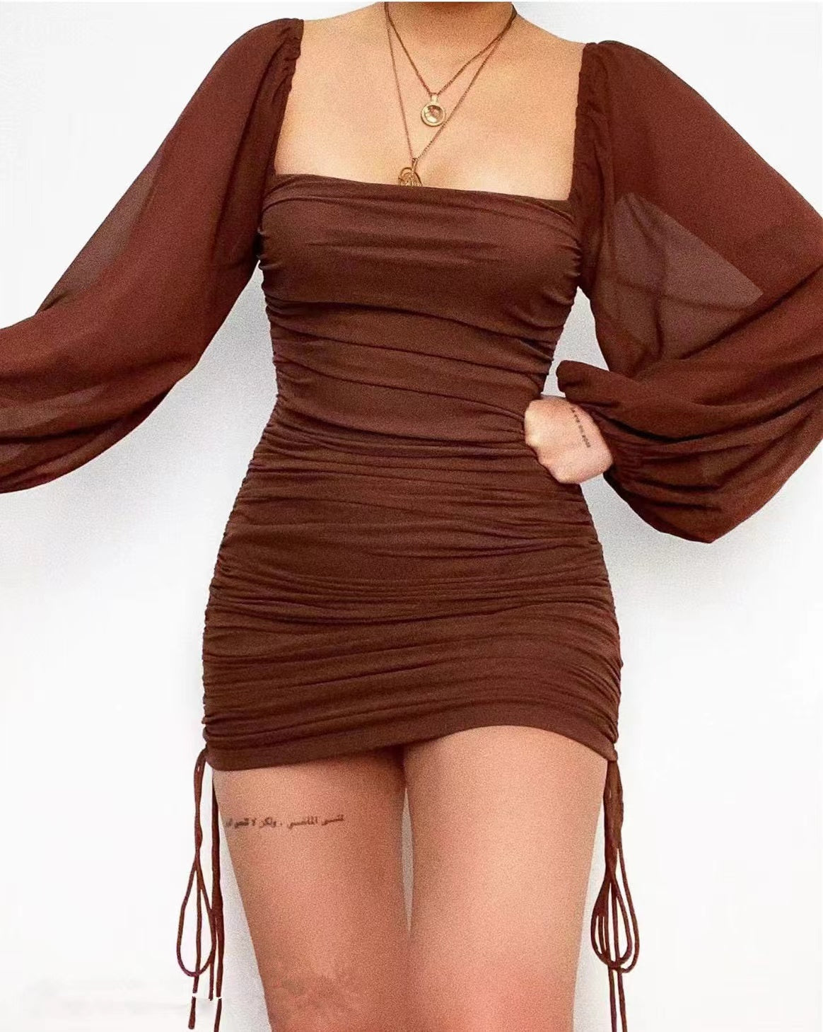 This on-trend ruched satin mini dress will keep your look elevated and chic. It features long sheer mesh balloon-style sleeves, a square neckline, ruching down the side seams, and a short, curve-hugging, bodycon silhouette to flaunt your gorgeous figure. Style with to impress on your next date night.