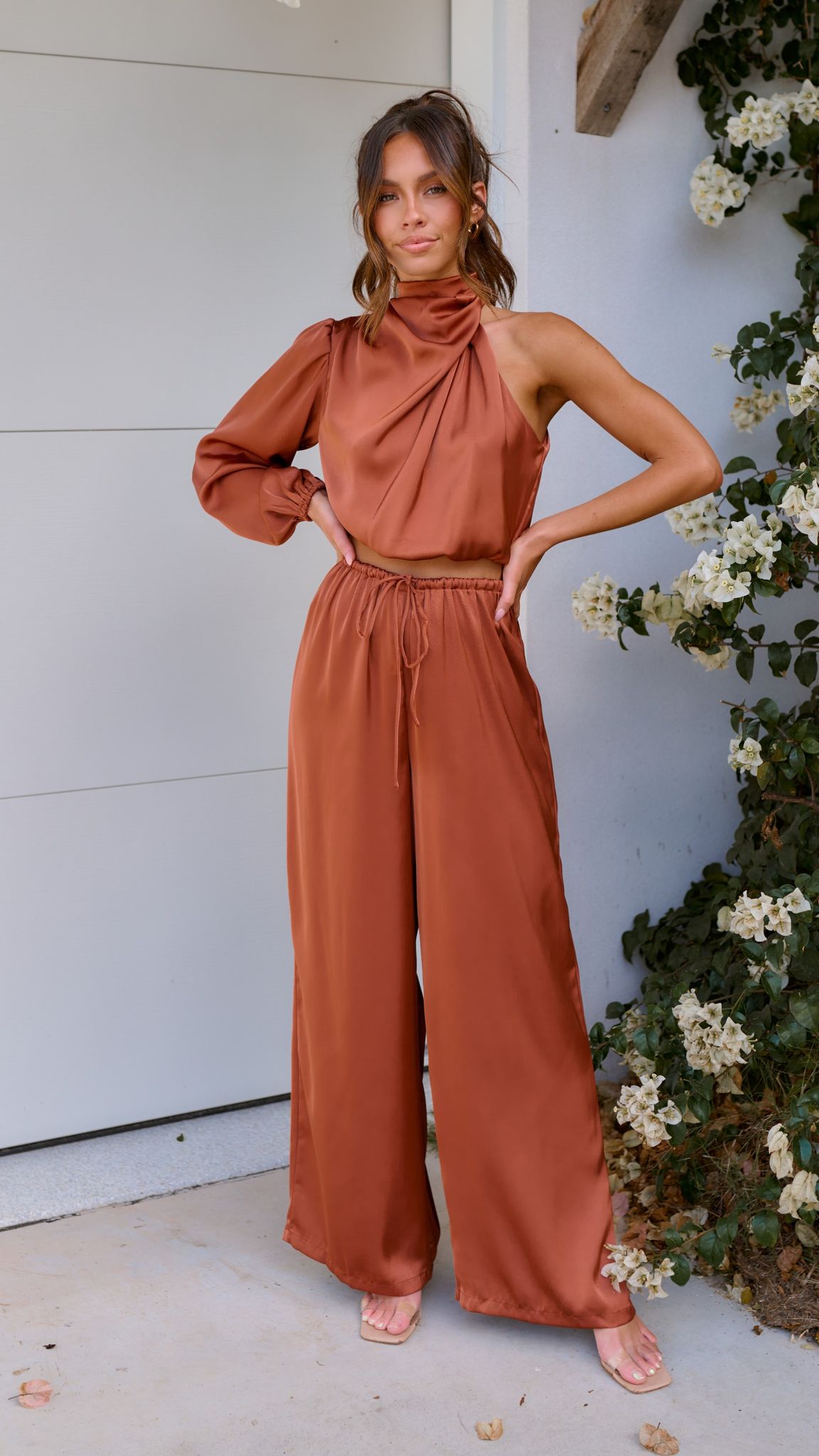 Get the look Aena Heel Nude/Clear and Zuri Pants - Copper