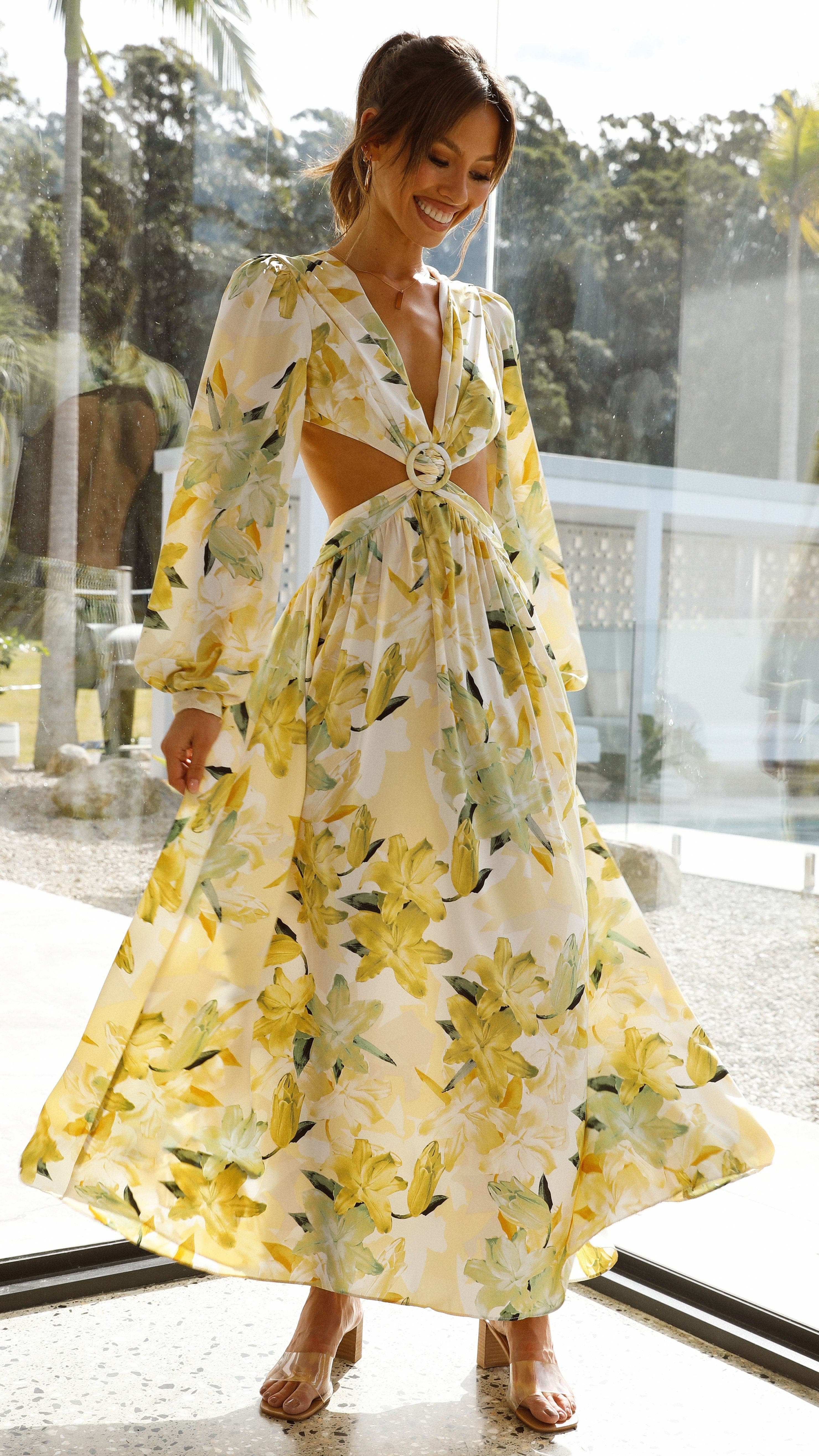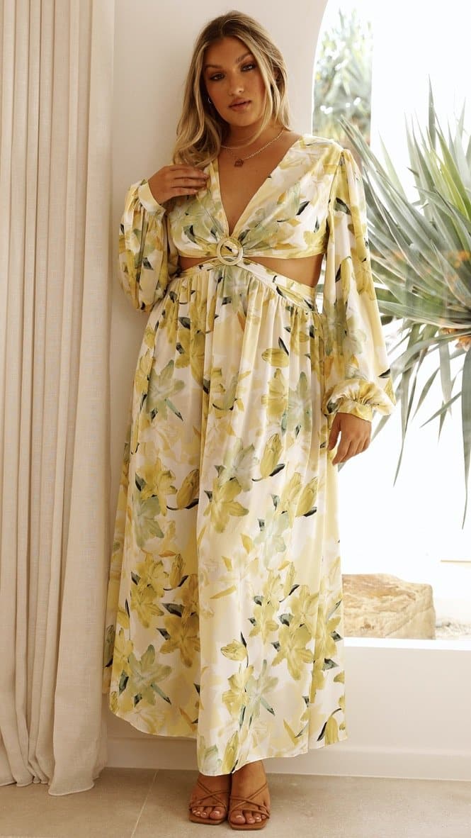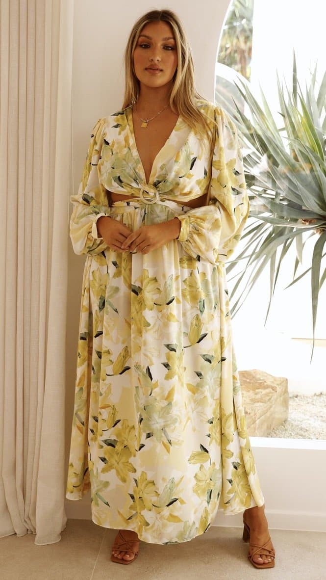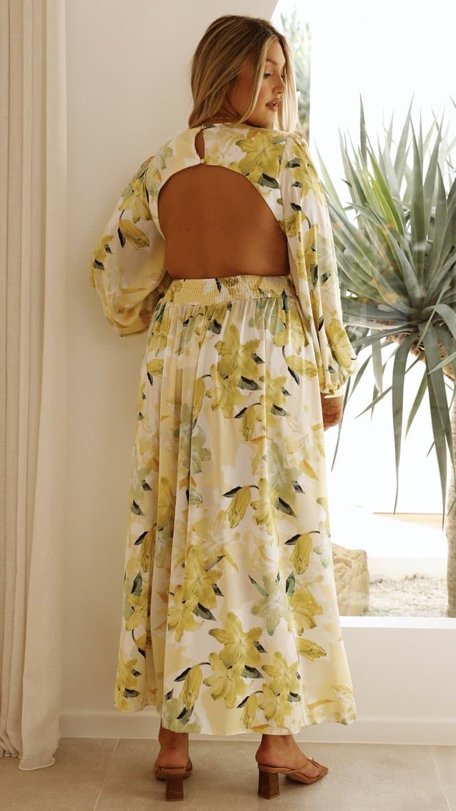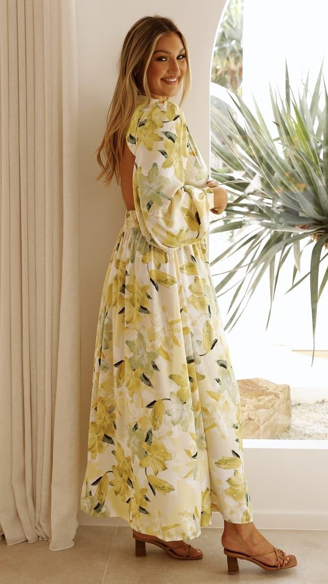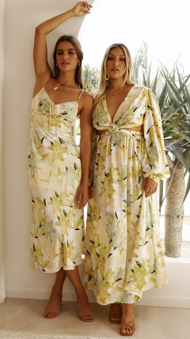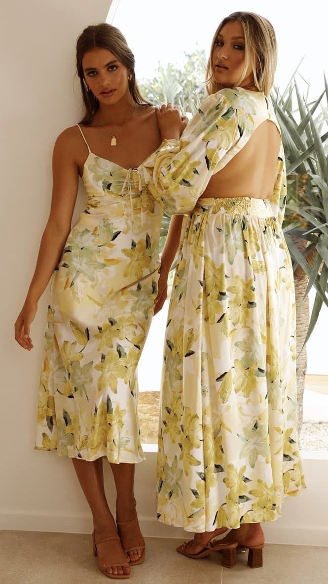 Our Jeanie Dress - Yellow Floral makes the perfect sophisticated and summery event dress! Wear it to weddings, cocktail events, parties or dinner plans - you name it! With the warmer seasons approaching, it's time to start outfit planning and this baby should be the first on your list! We recommend pairing this dress with Unika Heel - Sugar Brown for complementary tones.