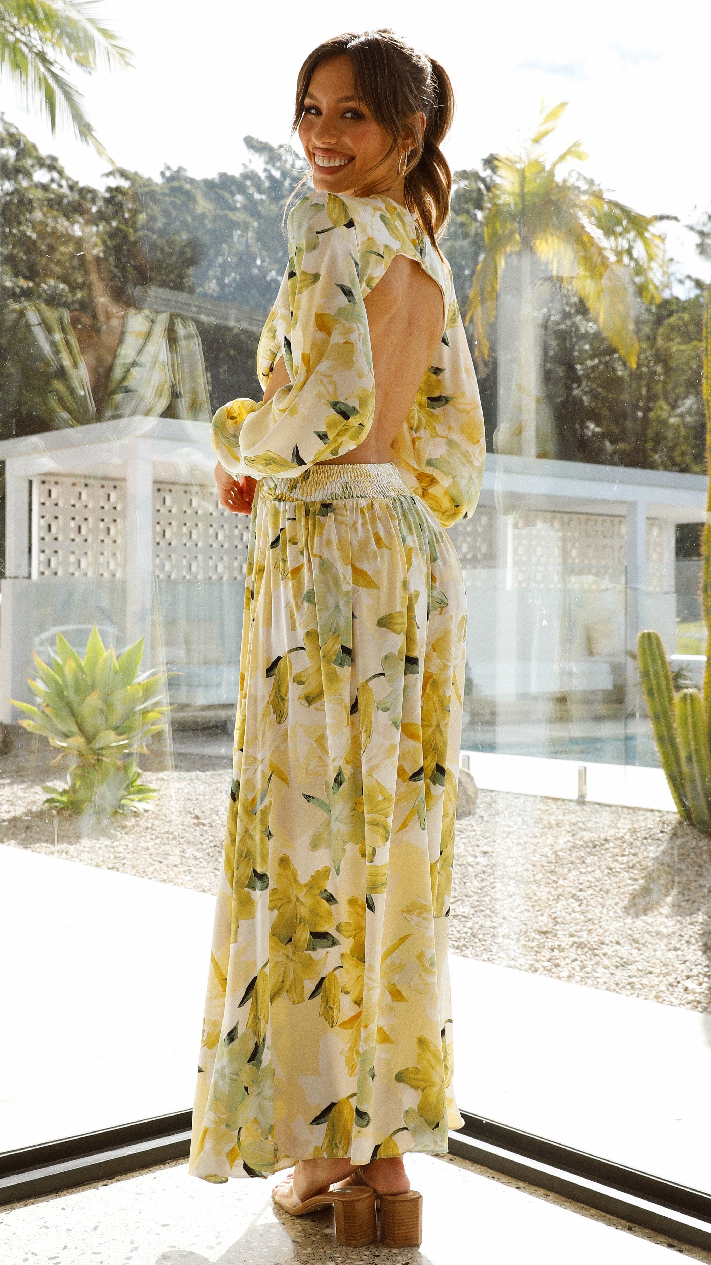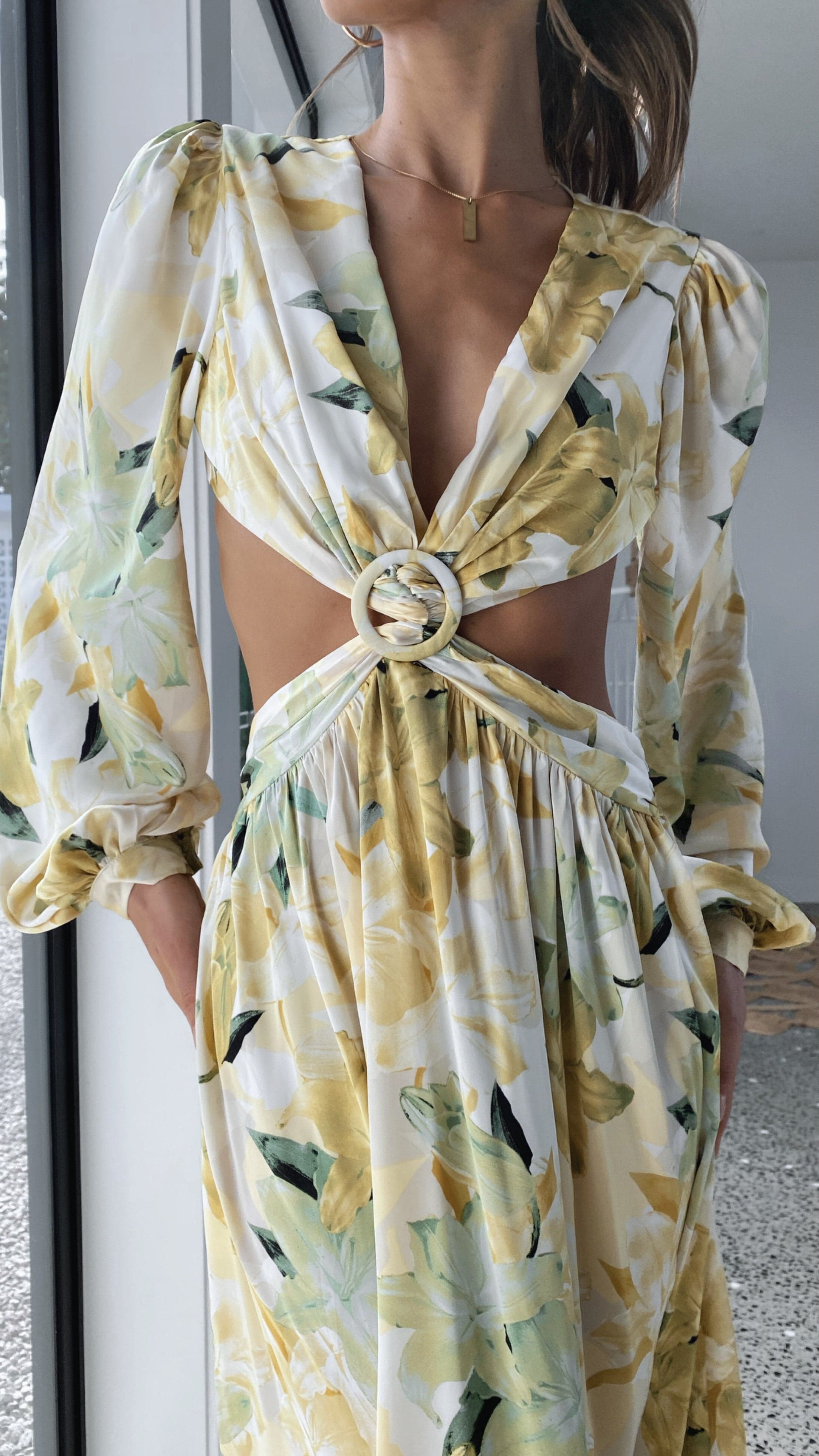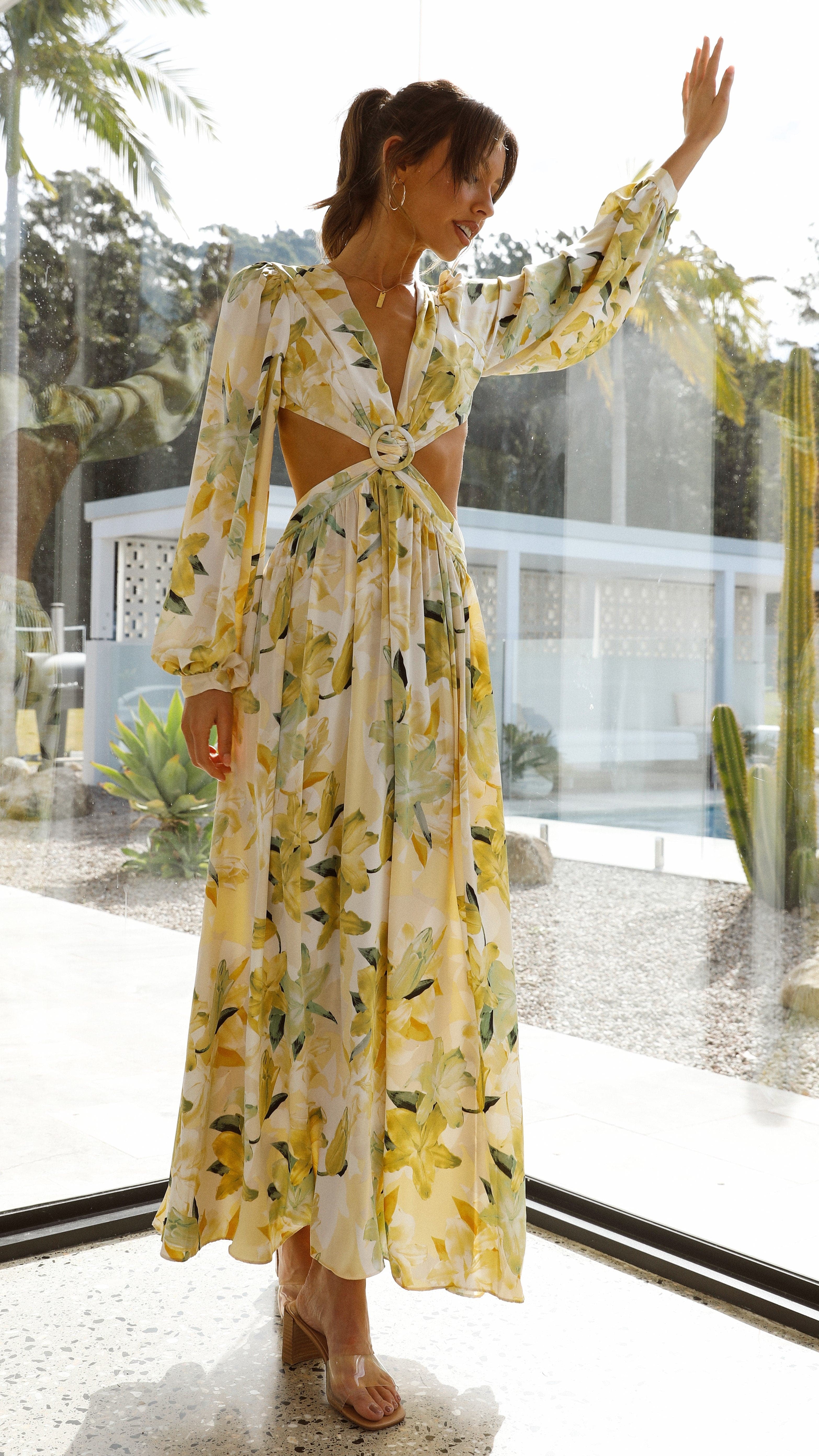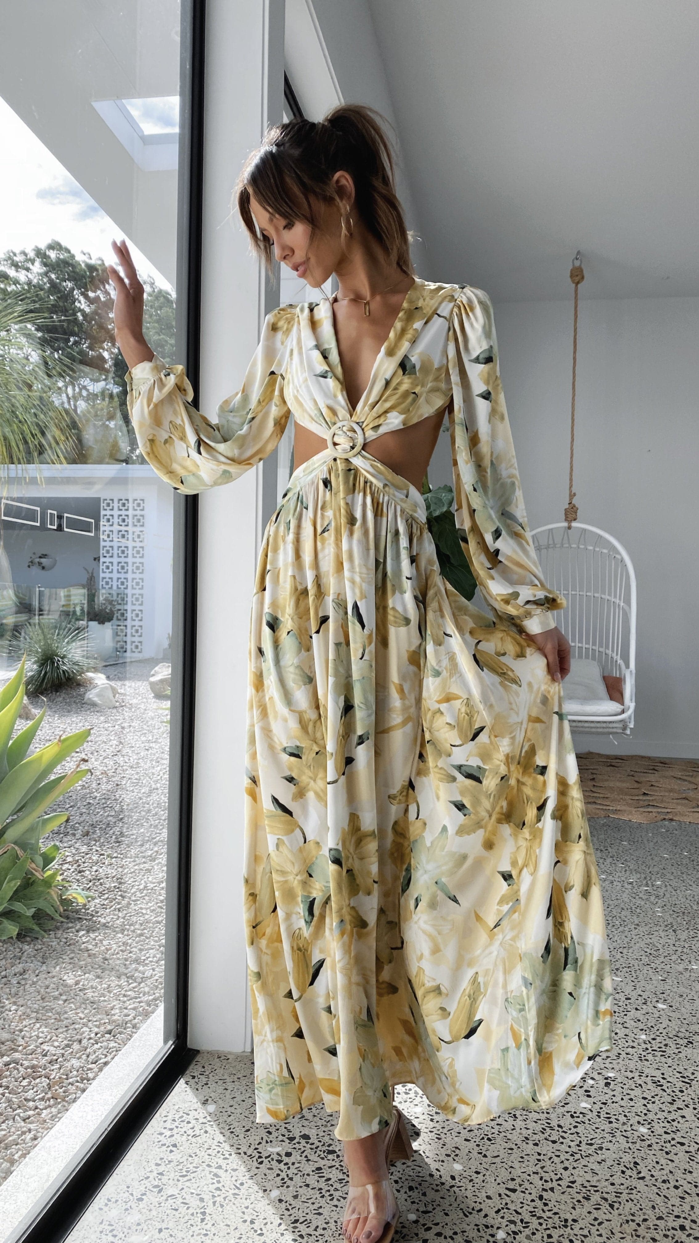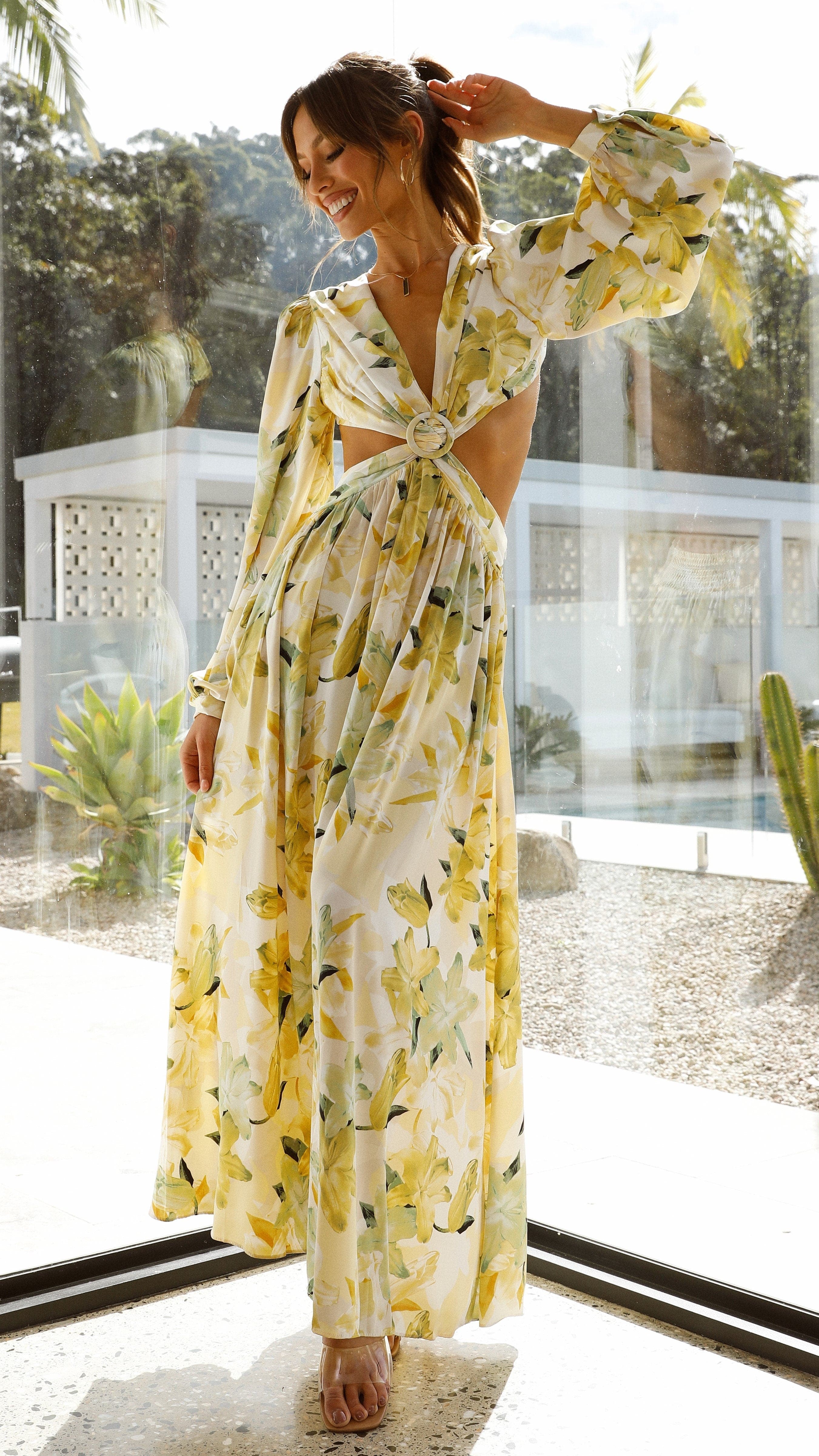 Our Jeanie Dress - Yellow Floral makes the perfect sophisticated and summery event dress! Wear it to weddings, cocktail events, parties or dinner plans - you name it! With the warmer seasons approaching, it's time to start outfit planning and this baby should be the first on your list! We recommend pairing this dress with Unika Heel - Sugar Brown for complementary tones.