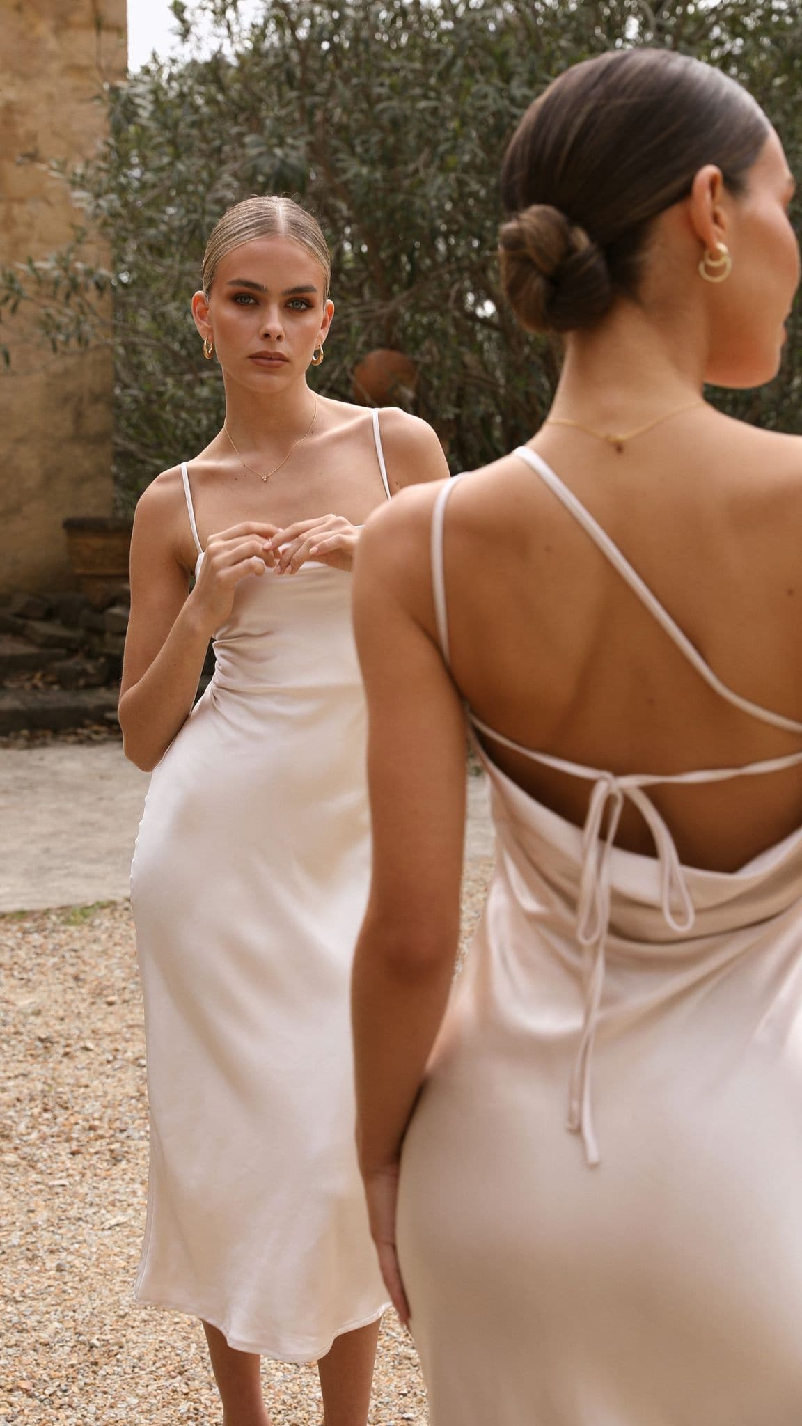 Our Josephina Midi Dress enhances your curves with it's on trend pleated one shoulder design and 2 strap open back. This one shoulder design is ultra flattering as it creates a stunning wrap across the bust making your curves pop! With such a versatile style and sleek satin look finish, this dress can be worn to any absolutely any event from parties to weddings. We'd recommend pairing with our Unika Heel - Sugar Brown and Mini Tube Hoop - Gold.