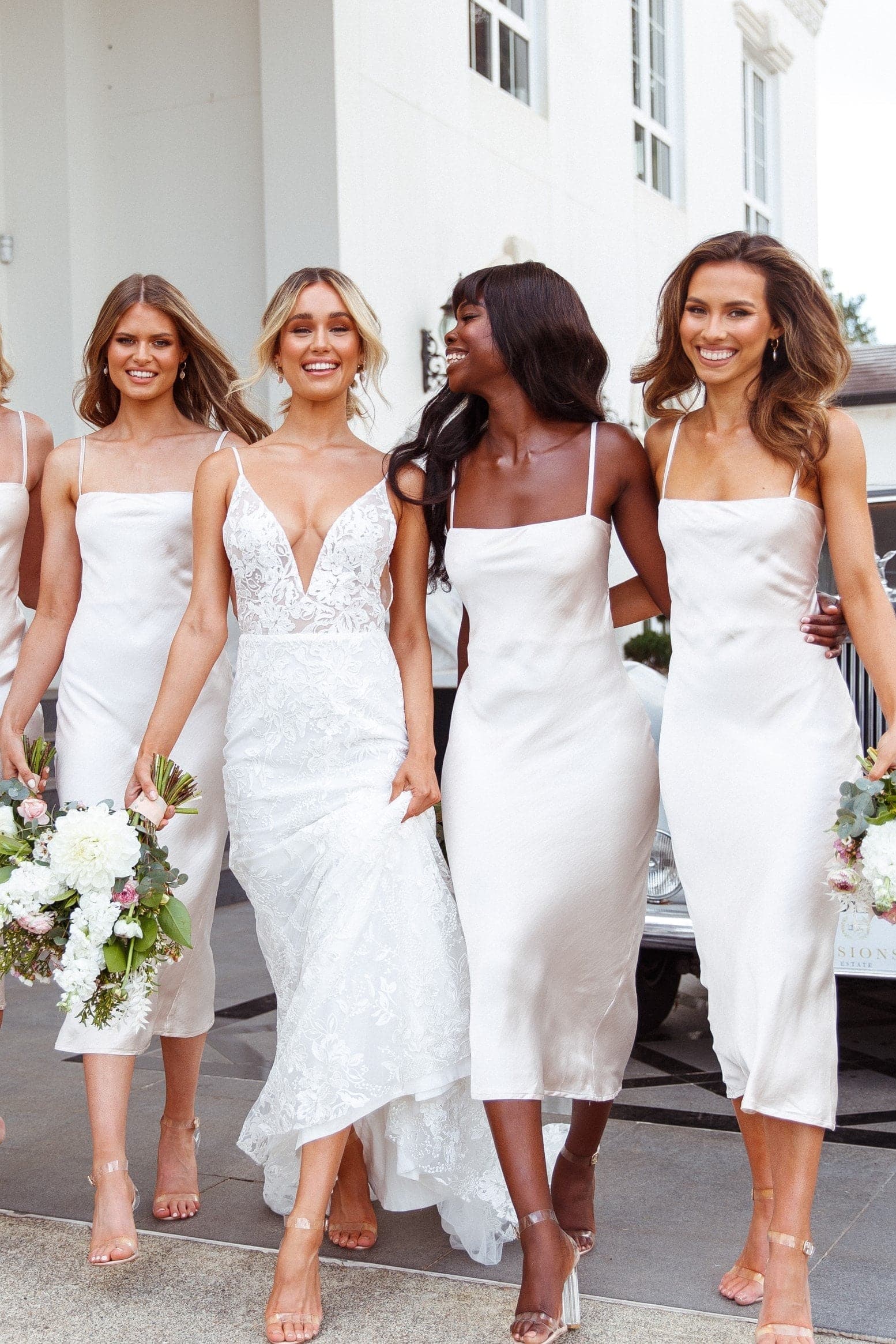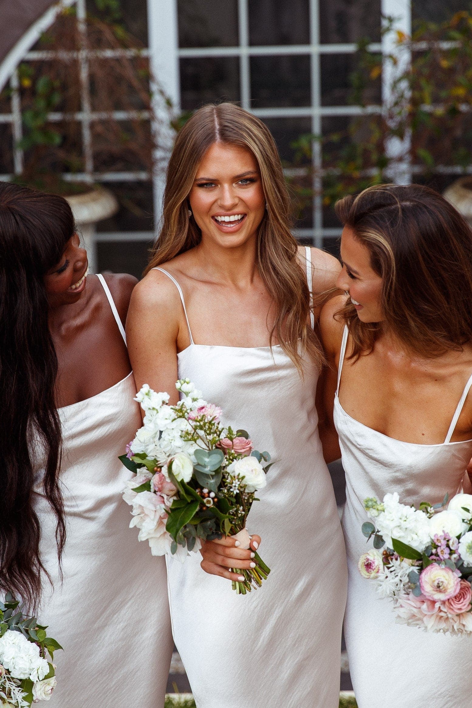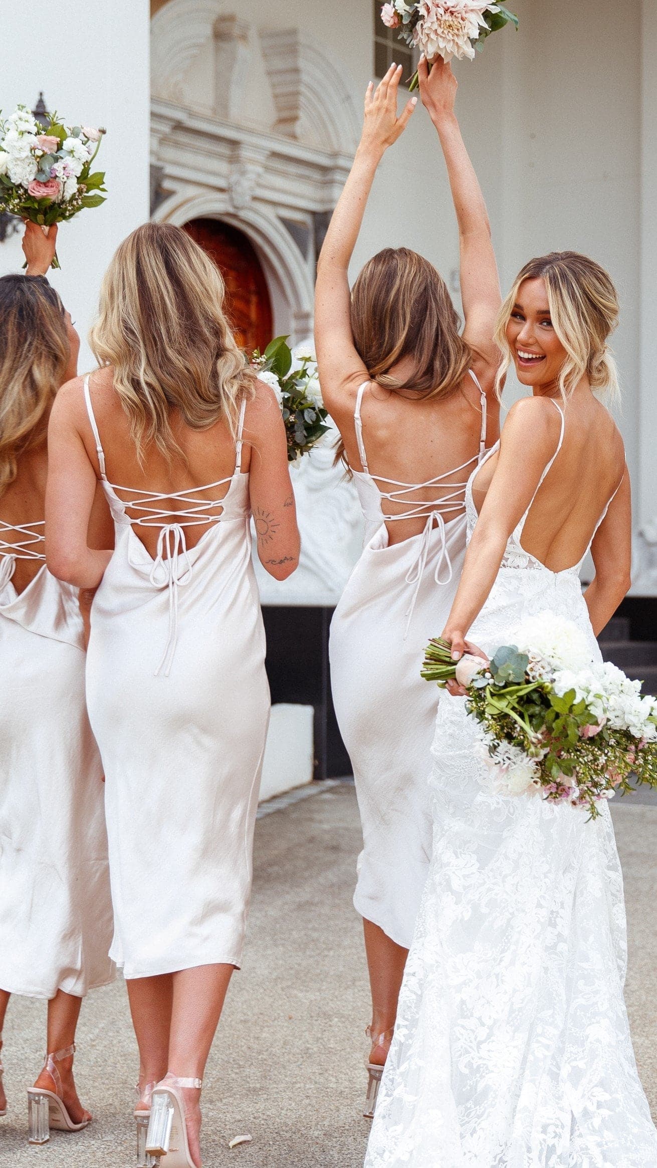 Our Keira Midi Dress is an elegant sophisticated style with a classical straight neckline and gorgeous adjustable crossed back design. This classical design makes it a must have for your next cocktail event and oh so easy to style. This stunning champagne hue makes a perfect rehearsal dinner, engagement party, bridesmaid dress or even simplistic wedding dress. Pair with our Lucy Heels and Madison Hoops in Gold for an effortless look.