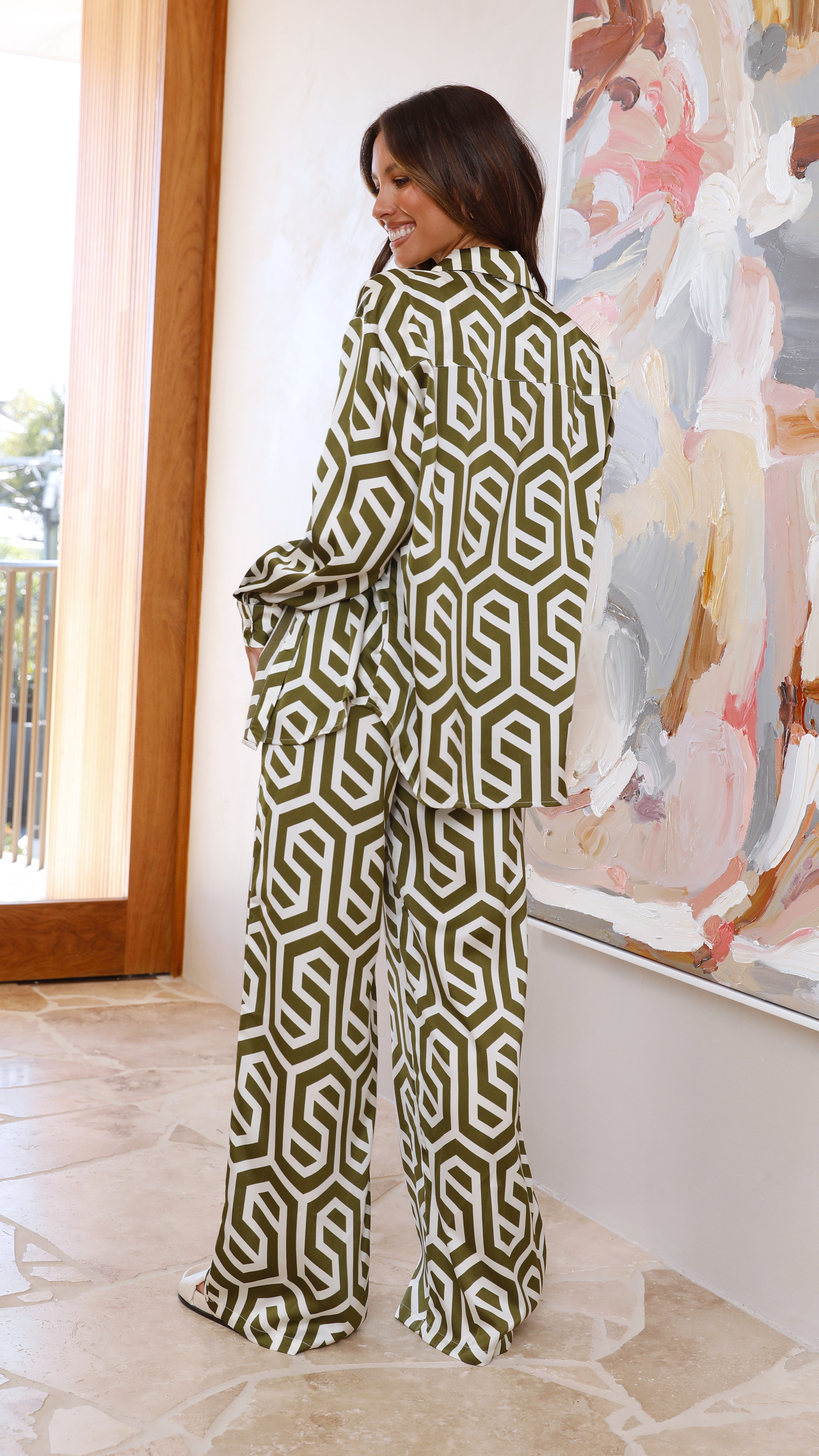 Get the look Lexus Pants - Olive Geo, Lexus Shirt - Olive Geo and Brooks Slide - Bone