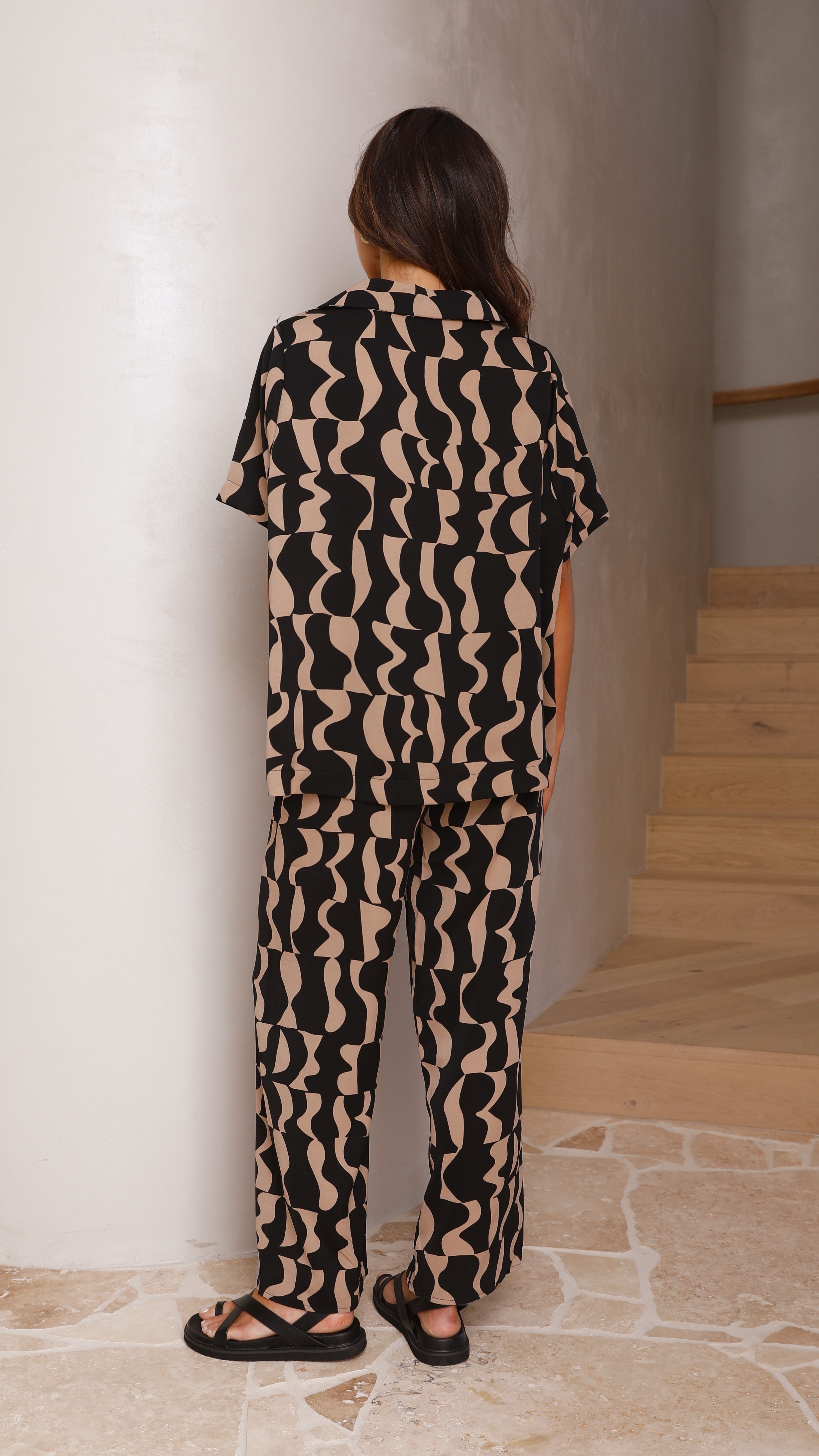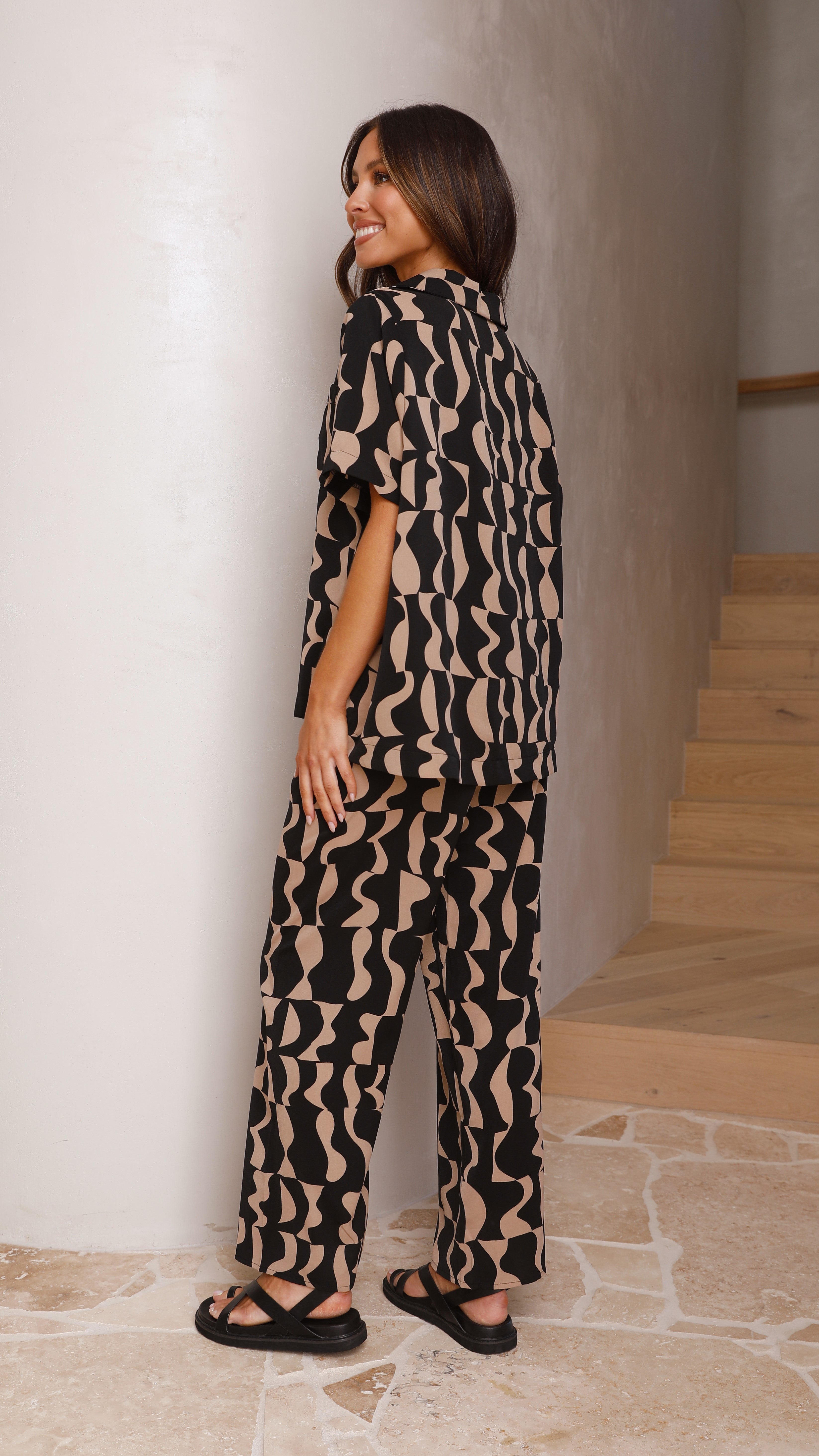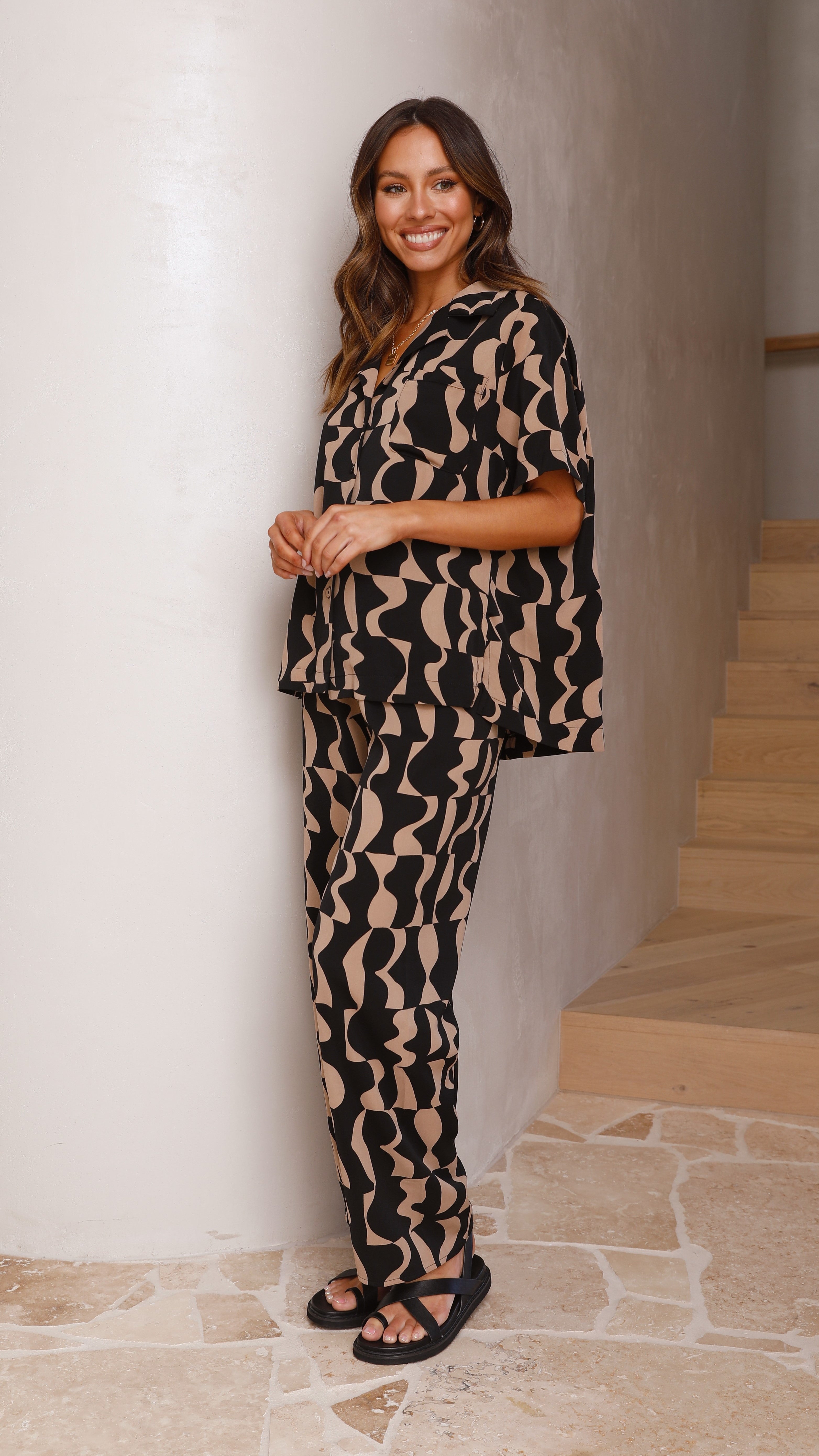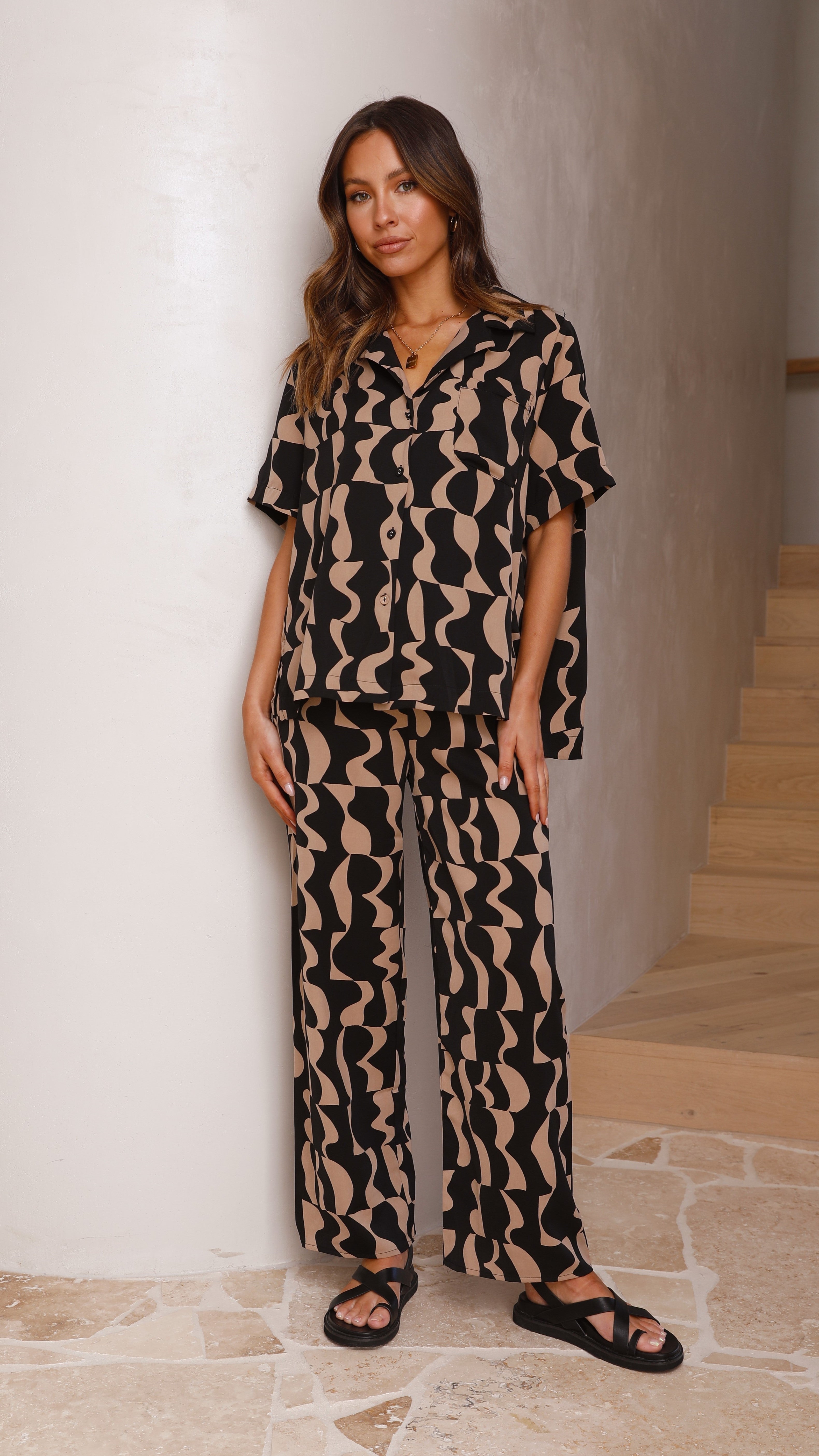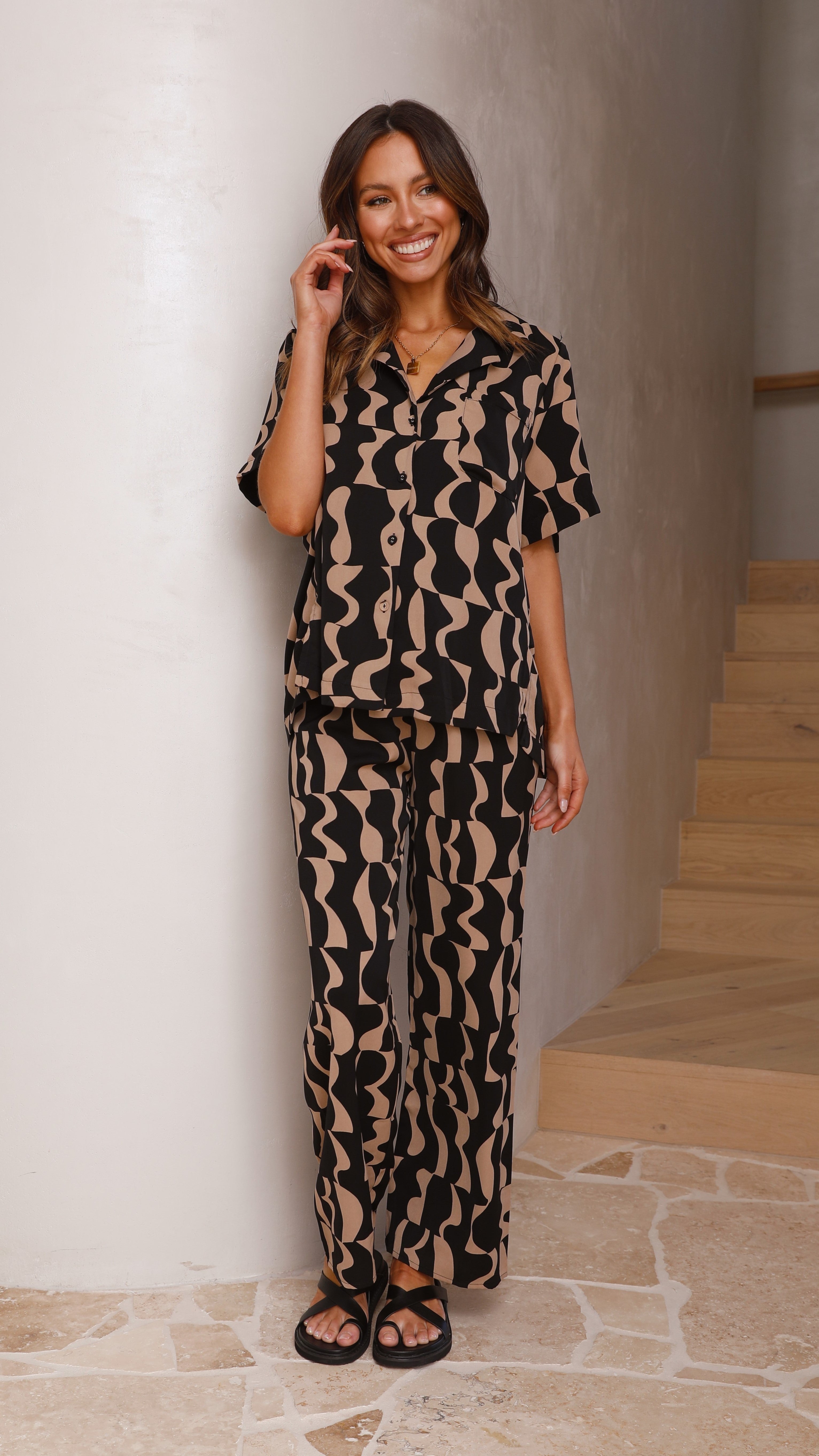 Get the look Zinnia Sandals - Black and Whitney Button Up Shirt - Black /Brown