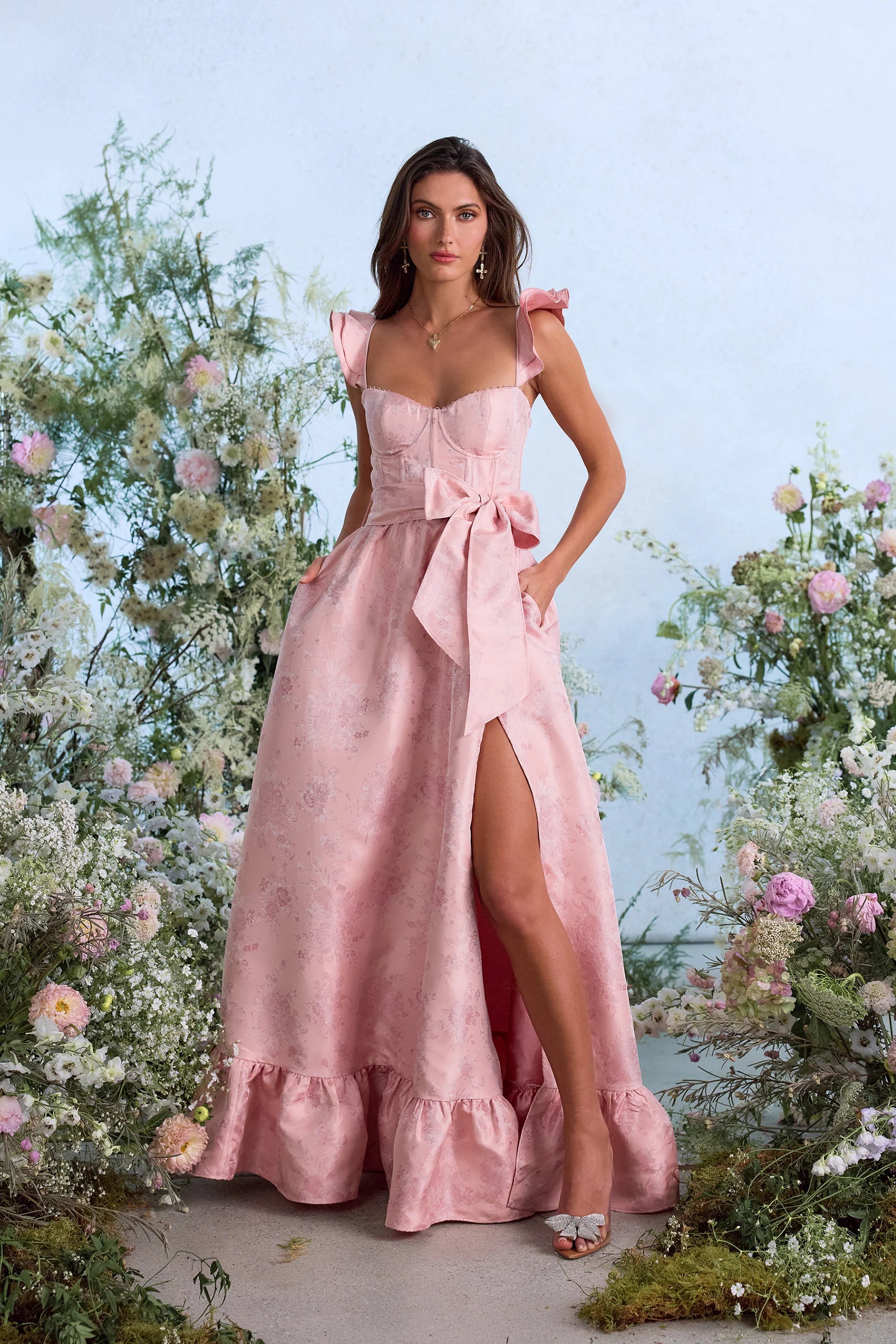 The Veronica Dress is a full-length corset dress featuring a side front slit and bow-tie belt. She's made in our romantic Light Pink Windsor brocade fabric, which flaunts light pink florals on a light pink background, and adorned with dainty loop trim and the sweetest ruffle details. She's classic, sophisticated, and ready for evenings out!